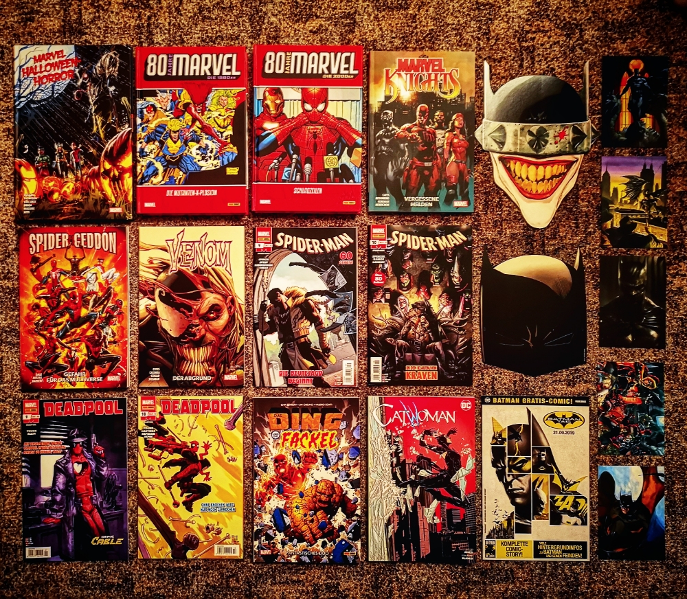 Diese Woche ist es „nur“ meine reguläre Abolieferung, von meinem Stammcomicshop , aber auch die hat es mengentechnisch und preislich in sich, wie man sehen kann. Die beiden vorletzten Ausgaben der 80 Jahre Marvel-Reihe, das Marvel Halloween Special, den Marvel Knights Reboot, die Heftausgaben von Spider-Man und Deadpool, Band 2 von Venom sowie weitere Goodies …