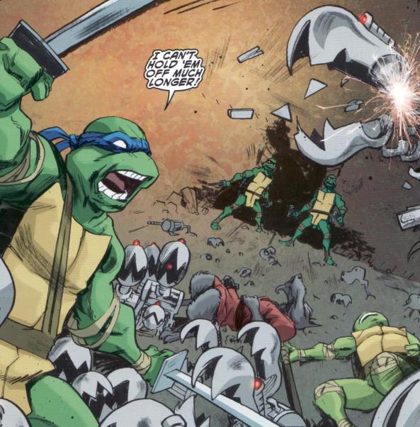 Auch ein wenig umgewöhnen muss man sich bei dem Artwork von Dan Duncan. Seine Turtles sehen inzwischen ein wenig deformiert aus. Die Köpfe seltsam nach oben gezogen, mit hoher Stirn. Das ist im ersten Moment schon ein wenig ungewohnt. Da sich aber ab der nächsten Ausgabe sowieso ein Zeichnerwechsel ankündigt, ist es nicht mehr so wichtig. Und so gravierend anders sehen die Turtles auch nicht aus. Dafür bleibt sein Artwork extrem dynamisch und voller Energie, was aber auch mit an der Koloration von Ronda Pattison liegt.