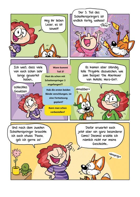 Eines gleich vorweg. Trotz Danielas cartoonigem Stil sind die Schattenspringer-Bände keine leichte, witzige Unterhaltungskost. Nein, mit teils sehr eindringlichen Worten, untermalt von ihrem ganz eigenen Stil, schildert sie ihre Erfahrungen und ihr Leben mit ihrem Autismus. Dabei dringt Daniela sehr tief in ihr eigenes Privatleben ein, lässt den Leser teilhaben, an ihrem Werdegang, bis zu dem Punkt, an dem sie endlich die Gewissheit hat, was an ihr so anders ist. Selbst dann spürt man ihre Erleichterung ganz deutlich und diese Ehrlichkeit in den Schattenspringer-Bänden macht sie so unglaublich besonders. Sie sind eben nicht nur eine Erzählung und Aufklärung über das Thema Autismus, sondern durch die teils starke persönliche Erzählweise fast wie ein Tagebuch.