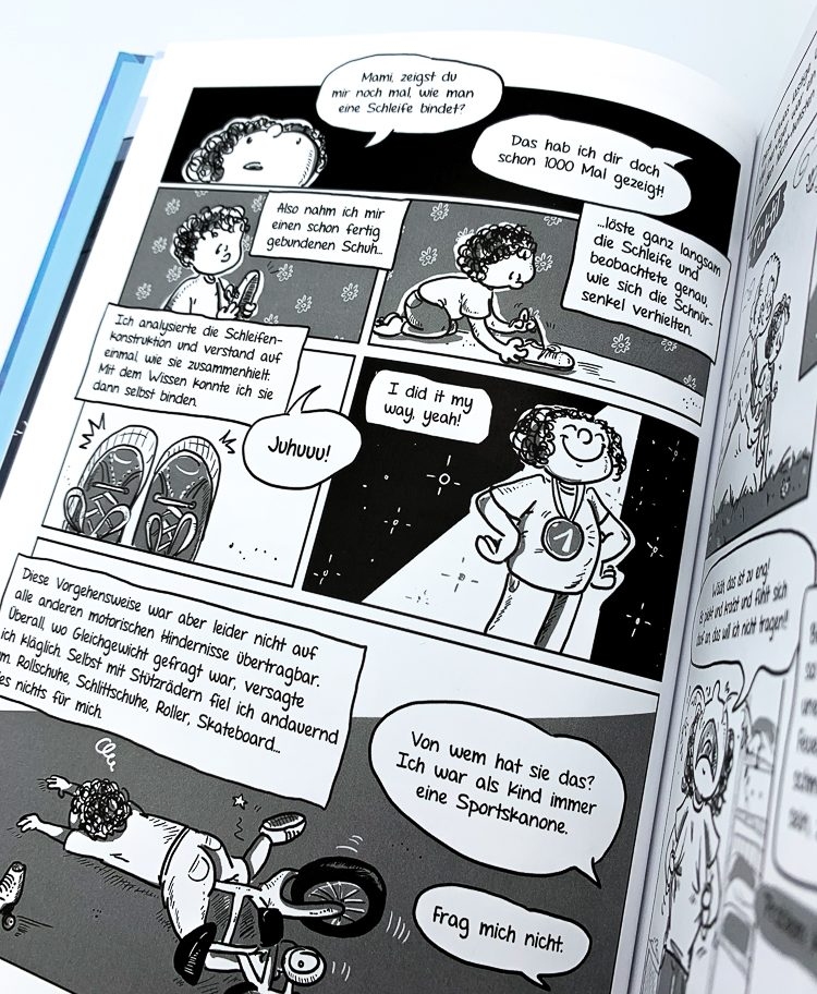 Wie bereits erwähnt, stehen die Zeichnungen von Daniela fast schon in einem starken Kontrast zur Thematik. Andererseits sind sie auch das ideale Mittel, dieses sehr ernste Thema nicht zu trocken zu präsentieren. Der Cartoonstil macht es dem Leser leichter, sich mit dem Thema und auch zu Daniela als Hauptakteur eine Bindung aufzubauen. Dass Daniela dabei immer wieder „scheinbar“ zur Überzeichnung gewisser Situationen und Ereignisse neigt, hilft ebenfalls. „Scheinbar“ deshalb in Anführungszeichen, weil Daniela schnell klarmacht, dass die Wahrnehmung von Nicht-Autisten sich deutlich von einem Autisten unterscheidet. Was für einen „normalen“ Menschen nur ein wunderschöner, sonniger Tag ist, kann für einen Autisten ein grelles, glühend heißes Blitzlichtgewitter bedeuten. All das zeigt Daniela sehr deutlich auf, ohne mit dem Zeigefinger zu winken.