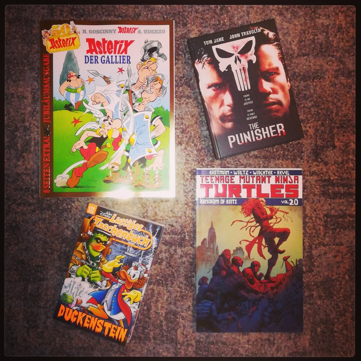 Letzte Woche gab es ja keine Comiceinkäufe, dafür gab es ein Live-Unboxing von Trachtman, welches ich am Sonntag noch einmal mit einem Fotospecial und Youtube-Upload hier auf dem Blog vorgestellt habe. Diese Woche gab es dann wieder Comicerwerbungen. Einmal eine Gratiszugabe zu einer Egmont-Shop-Bestellung. Ein Lustiges Taschenbuch, dann die aktuelle Ausgabe der Teenage Mutant Ninja Turtles Ongoing-Paperbackserie und den ersten Asterix-Band als 50 Jahre Jubiläumsausgabe als Rezensionsexemplar. Dieses Review findet ihr nächsten Sonntag im Rahmen des Asterix Review Specials wieder.