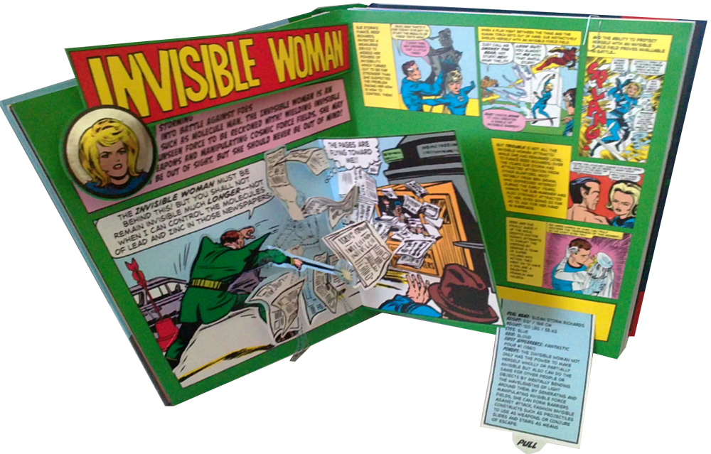 Auch Susan Storm, alias Invisible Woman bekommt eine eigene Seite spendiert. Sie tritt gegen den Molekule Man an und am beeindruckendsten ist die Tatsache, dass man für sie durchsichtige Plastikfolie bedruckt hat, um ihre Unsichtbarkeit zu verdeutlichen. Dazu kommen umherwirbelnde Zeitung, die sich zwar nicht wirklich bewegen, aber auf verschiedenen Ebenen herausgehoben werden, sodass sie zu fliegen scheinen. Abgerundet wird die Seite wieder, durch ein ausziehbares Fact File am unteren rechten Rand.