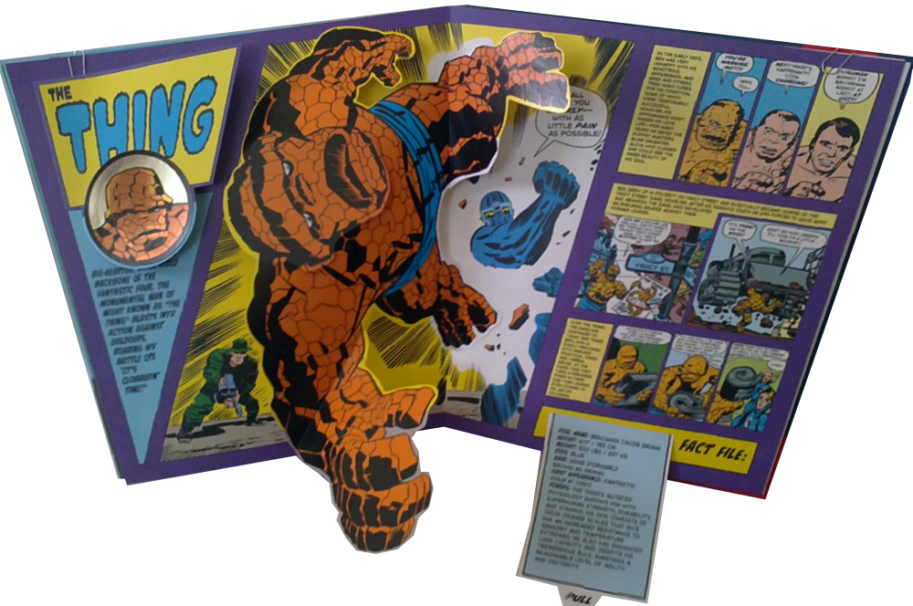 Welches Cover würde sich besser eignen, als das von Fantastic Four Nummer 1 um ein 3D-Pop Up- Buch zu beginnen? Keines! Und genau deswegen hat man sich dieses Cover geschnappt und hier wundervoll in Szene gesetzt. Während der rechte Arm des Monsters mit Sue eine leichte Kreisbewegung beschreibt, treten die restlichen Teammitglieder durch eine ausgeklügelte Mechanik in den Vordergrund. Auf der rechten Seite gibt es in ausführlichen Comicbildern die Origin. Herausziehbare Zusatzinfos gibt es diesmal leider keine.