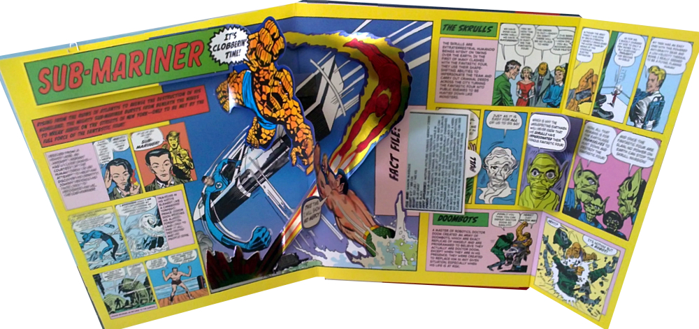 Zum großen Finale ist Johnny Storm an der Reihe. Während er in den Klauen seines Gegners gefangen ist, kommt ihm sein Teamkollege und Sticheleifreund Ben Grimm zu Hilfe. Der Pop Up-Effekt wirkt leider nur halb so schön, da er viel zu verschachtelt ist und man schon den richtigen Blickwinkel benötigt. Insgesamt einer der schwächsten Effekte im ganzen Buch. Dazu gibt es wieder ein Fact File am unteren Rand rechts.