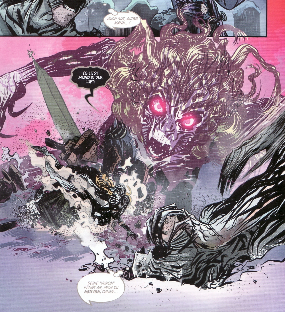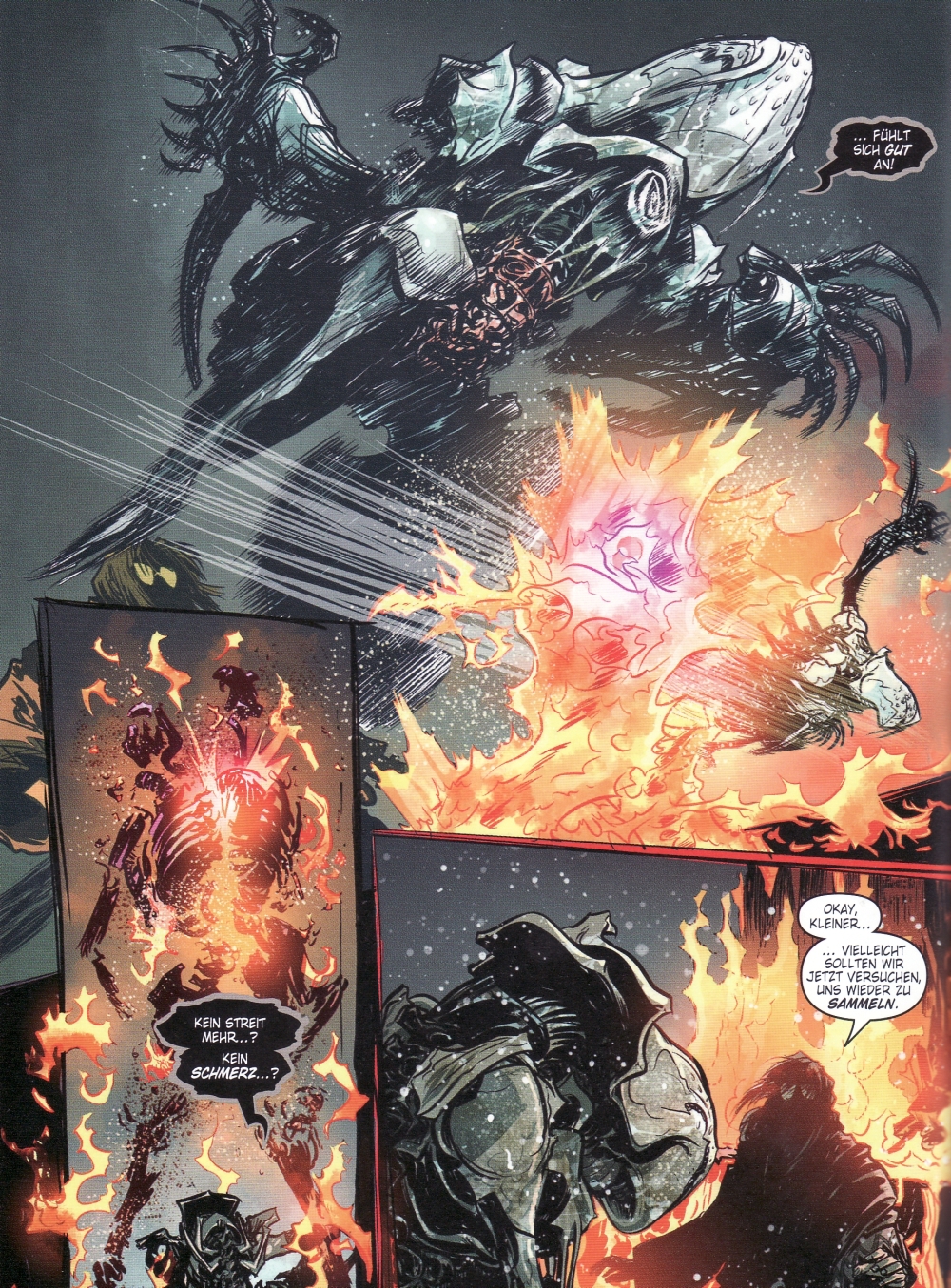 Wo der letzte Band noch ziemlich unsicher in keine wirkliche Richtung tendierte, zeichnet sich hier ab, dass Joe Casey und Nathan Fox ein Ziel verfolgen. Die Geschichte nimmt massiv an Spannung auf und entwickelt sich fast schon zu etwas Epischem, als es plötzlich mit einem Riesencliffhanger vorbei ist. Zwar gibt es noch immer Handlungselemente, die unklar wirken, aber es scheint einen Sinn zu geben. Einen Sinn, der sich dem Leser nur nach und nach erschließt. Doch dazu wird es wohl nicht mehr kommen. Ich bin ehrlich. So wie es hier weiterging, hätte es mich echt angefixt weiterzulesen. Der Kampf der Kilgores gegen eine ganze Kirche, die es auch noch irgendwie schafft mit Rieseninsekten auf die Menschheit loszugehen hat schon etwas Faszinierendes. Joe Casey inszeniert einen spannenden Mystery-Thriller mit biblischen Anleihen der einen aber leider nur langsam in Bann zieht. Und dies ist wohl auch der Grund, warum viele Leser abgesprungen sind. Ich bin mal gespannt, wie Todd diese Story in Spawn weiterführen und auflösen wird, oder ob er nach dem Cliffhanger einfach einen Whiteout einsetzt, um Haunt eine komplett neue Richtung zu geben. Ob als Held oder Schurke, alles scheint jetzt offen zu sein.