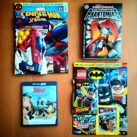 Nach dem Mega-Update letzte Woche ist es heute ein bisschen weniger. Gerade einmal drei Comics und eine Blu-ray, dafür aber mit Comicbezug sind es diese Woche geworden. Da wären zum einen die jeweils aktuellen Magazine von Spider-Man mit der siebten Ausgabe und Lego Batman mit der zweiten Ausgabe und einem Robin als Minifigur-Extra. Da freue ich mich auch schon auf die nächste dritte Ausgabe am 7. Mai mit einer Superman-Lego-Minifigur. Außerdem gab es noch die gestern erschienene 26. Ausgabe der Lustiges Taschenbuch-Reihe Ultimate Phantomias. Da hätte ich zu Beginn nie gedacht, dass es diese Reihe mal auf so viele Ausgaben bringen würde. Zuletzt ist da noch die 3D-Blu-ray von „Asterix im Land der Götter“, die ich mir für einen 10er gegönnt habe, obwohl ich die DVD schon besitze. Aber seit ich die Playstation-VR habe und damit auch 3D-Filme sehen kann, gibt es immer wieder mal Filme, die ich mir gerne in 3D hole …