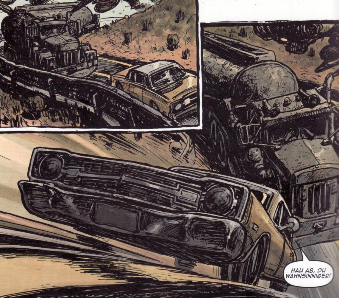 Visuell ist der Band auf ganzer Linie ein wahres Highlight. Sowohl die grafische Umsetzung der King-Adaption von Nelson Daniel als auch das von Rafa Garres visualisierte Original überzeugen mit vielen Details und stimmungsvollen Bildern. Bei der Version von King, „Vollgas“, bestimmen klar strukturierte Linien und große Flächen das Gesamtbild. Schatten und Abstufungen werden hierbei vor allem durch die Koloration erzeugt. Dem gegenüber steht „Duell“ von Matheson. Hier sind die Bilder wesentlich düsterer und zeugen von einer gewissen Verzweiflung, die den Hauptdarsteller David Mann von dem Moment an begleitet, an dem sich sein Weg mit dem des Truckers kreuzte. Und dies schafft Rafa Garres mit seinem kantigen Stil perfekt einzufangen. Das bewirkt er vor allem durch sehr viele Schraffuren, ungewöhnlich viele Linien in verschiedenen Strichstärken, und nur sehr wenig freien Flächen. So unterschiedlich, wie die Geschichten trotz der gemeinsamen Basis sind, so verschieden sind auch die Grafikstile.