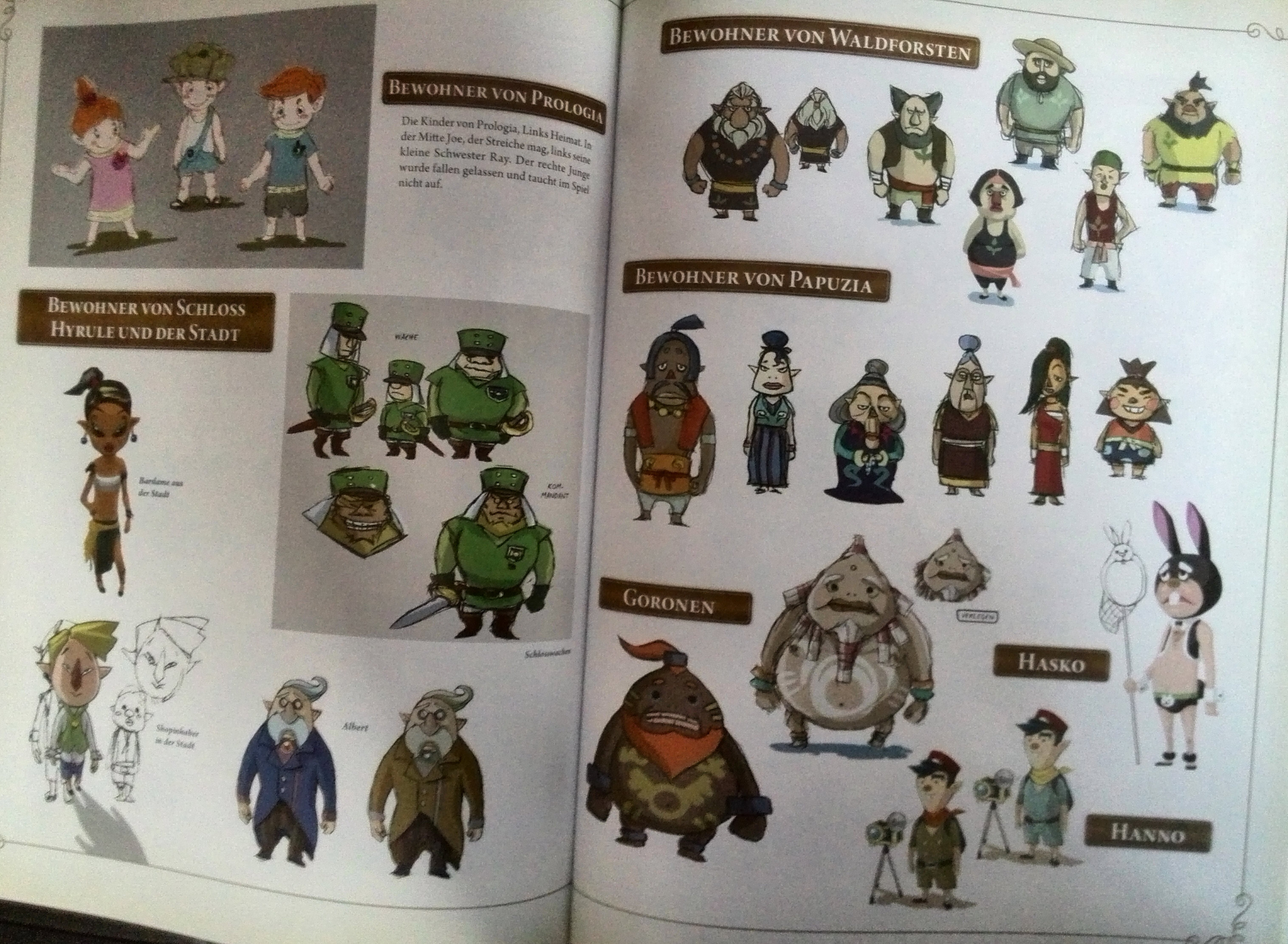 Charaktere und Orte der gesamten Spiele werden dargestellt in unvollendeten Zeichnungen. Hier gibt es so viel zu entdecken, das ist wirklich unglaublich. An vielen Orten und Charakteren ist in sehr kleiner Schrift zu erkennen, was alles zu beachten ist oder geändert werden soll. Hier muss ich dazu erwähnen, dass diese kleine Schrift wirklich stellenweise so fitzelig klein an die jeweiligen Charaktere geschrieben wurde, dass es nicht immer ganz einfach ist diese zu lesen. Beinahe jeder Charaktere und jedes Monster wird hier vorgestellt, dazu die einzelnen Ortschaften der Spiele. Interessant ist noch, wie amüsant einige Skizzen umgesetzt wurden. Immer wieder zwischendurch muss man einfach lachen, denn einzelne Skizzen Beschriftungen laden einfach zum schmunzeln ein. So zum Beispiel bei der Darstellung der Goronen wenn sie rollen. Ein Mitarbeiter Kommentar: Kopf, (kann so sicher schlecht rollen…). Interessant ist auch noch mal zu sehen, wie sich das Charaktere – Design im Laufe der Jahre verändert hat. Von 1986 bis 2011 wird dies anhand einzelner Schaubilder sehr schön verdeutlicht. Der Spielekatalog fasst noch einmal alle Spiele die je erschienen sind kurz und bündig für die einzelnen Konsolen zusammen. Das Schlusswort nach getaner Arbeit kommt von