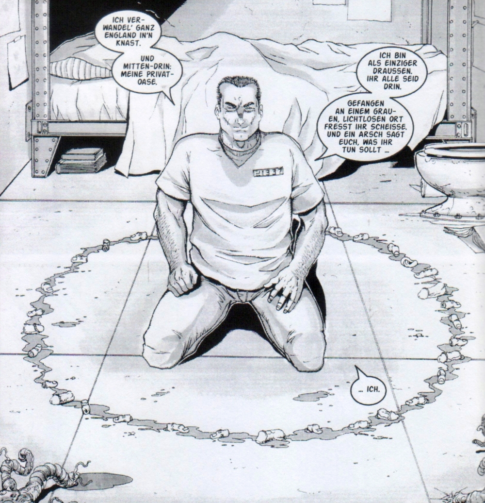 Ellis hat so ziemlich jede kranke Idee zu Papier gebracht die einem auch nur einfallen kann. Oder auch nicht. Denn vieles davon ist so pervers und abgedreht, das man im ersten Moment erschrocken ist. Aber je weiter die Geschichte voranschreitet umso mehr erkennt man, dass Spider Jerusalem nur ein Mensch ist. Ein Mensch mit Fehlern und auf der Suche nach der Wahrheit. Ein Mensch mit außergewöhnlichen Mitteln der auf ungewohnten Wegen sein Ziel zu erreichen versucht. Ein Mensch mit dem Herzen am rechten Fleck und einer Schnauze, die sich nicht scheut, alles ungeschönt auszusprechen. Und dann merkt man. Nicht Spider ist das Arschloch, sondern die Welt um ihn herum.
