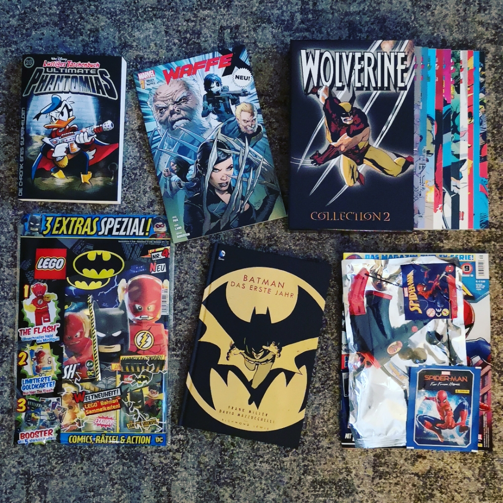 Heute fasse ich mal wieder die letzten beiden Wochen zusammen, da sich zum einen nicht ganz so viel getan hatte und ich zum zweiten viel zu faul war letztes Wochenende und ich mich zur Ablenkung lieber auf TikTok herumgetrieben habe. Da fällt mir ein, dass ich mal wieder ein paar ausgewählte Videos hier posten könnte. Naja, aber heute erst einmal meine neuesten Errungenschaften. Diesmal in drei Bildern. Den Anfang machen die aktuellsten Errungenschaften. Neben den neuen Ausgaben vom Lego Batman-Magazin mit Flash-Minifigur und dem Spider-Man-Magazin, sowie dem Lustigen Taschenbuch Ultimate Phantomias #28, gab es nach langem hin und her endlich den zweiten Wolverine Collection-Schuber und vom lieben Emauel Brauer (schaut ruhig mal auf seinem Blog „Bizzaroworldcomics“ vorbei) hab ich mir „Batman: Das erste Jahr“ gekauft und den „Waffe X“-Band gab es noch als Geschenk obendrauf …