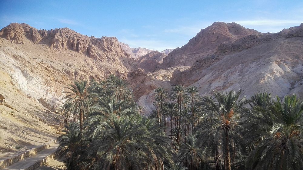 Wir sind nahe der algerischen Grenze weitergefahren zu einer tunesischen Bergoase (Chebika) im Atlasgebirge. Das Gebirge erstreckt sich von Marokko bis Tunesien, so ziemlich durch den ganzen Norden Afrikas. Quellen entspringen diesem Gebirge, werden zu einem Bach und münden in einem kleinen Wasserfall. Das Wasser ermöglicht den Anbau von Palmen. Interessante Gesteinsformationen und üppiges Grün sorgen für einen spektakulären Ausblick in dieser Gegend. Früher war dieser Ort ein römischer Vorposten, später siedelten hier Berber und betrieben neben der Oasenwirtschaft auch Trockenfeldbau. Das alte Dorf wurde durch Überschwemmungen zerstört, teilweise aber restauriert.